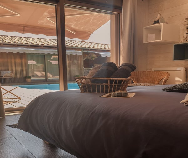 Nos chambres d'hôtes dans les Landes ne sont pas de simples espaces de repos - elles sont conçues comme des refuges où vous pouvez vous reconnecter à l'essentiel. L'ambiance apaisante, les matériaux naturels et la vue sur la piscine et le jardin créent un environnement propice à la détente et à l'introspection.